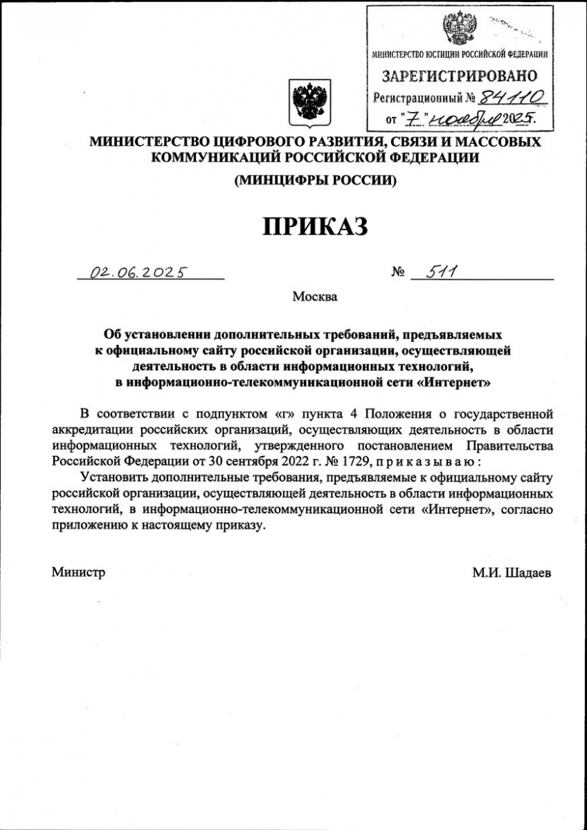 Приказ Министерства цифрового развития, связи и массовых коммуникаций Российской Федерации от 02.06.2025 №511 "Об установлении дополнительных требований, предъявляемых к официальному сайту российской организации, осуществляющей деятельность в области информационных технологий, в информационно-телекоммуникационной сети "Интернет".