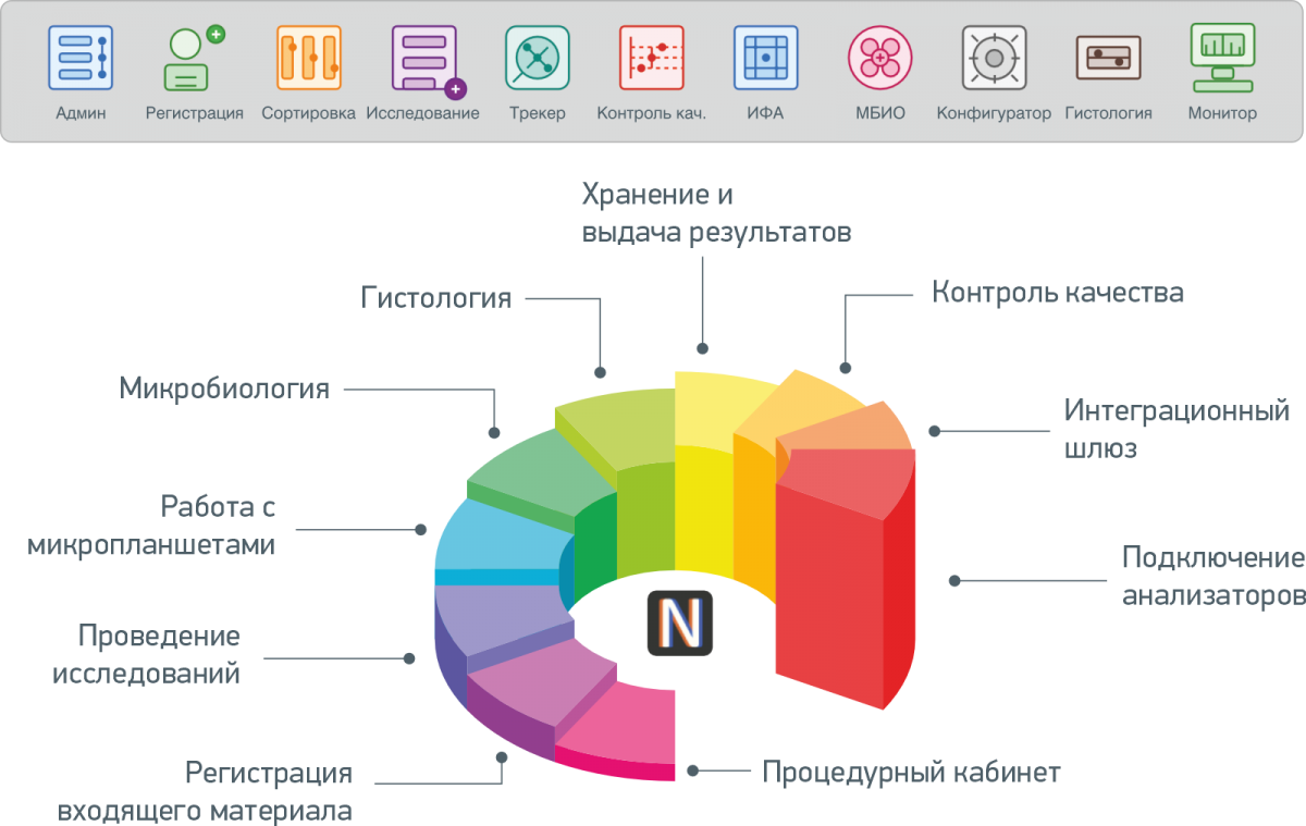 Лаборатория NLab может работать не только как составная часть МИС «Ариадна», но и как независимый продукт, взаимодействующий с любыми медицинскими информационными системами. ЛИС NLab представляет собой единый комплекс – от процедурного кабинета до выдачи результатов и статистики. В состав системы входит мощный инструмент для подключения лабораторного и медицинского оборудования. Это собственная разработка, которая позволяет не только поддерживать работу различных middleware-решений, но также подключать анализаторы, минуя middleware поставщиков лабораторного оборудования. В состав системы входят компоненты для работы с принтерами этикеток, поддерживающие печать CODE128, 2of5, QR-code.